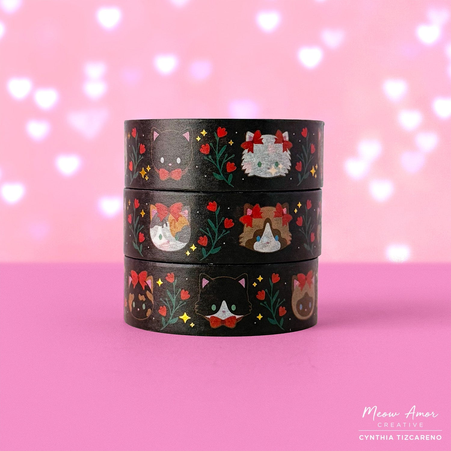 Enhance your crafts with the Romantic Cats Black Gold Foil Washi Tape. Featuring sweet cats wearing red bows surrounded by vibrant red florals on a sleek black background, this tape is finished with shiny gold foil accents for a charming and elegant look. Perfect for adding a cute, romantic touch to your planners, gifts, and creative projects.