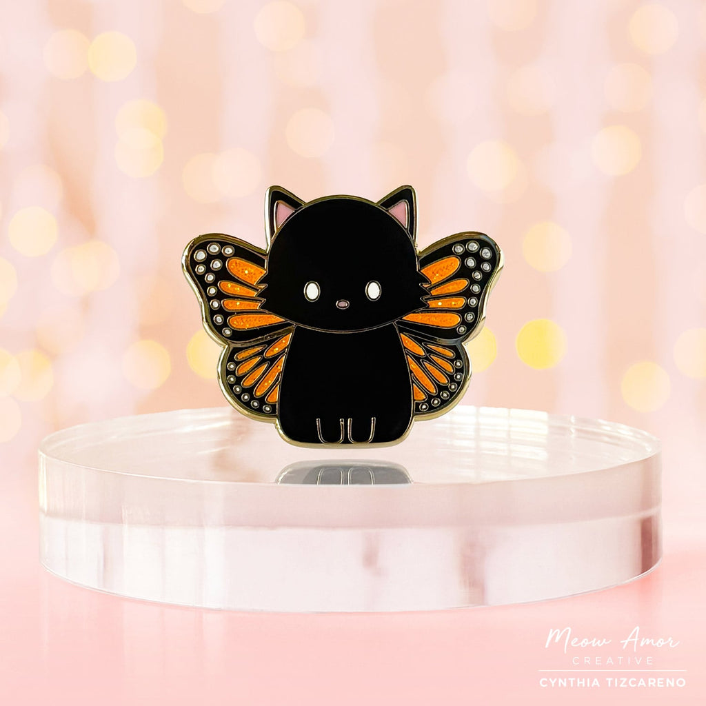 Monarch Butterfly Black Cat Glitter Enamel Pin