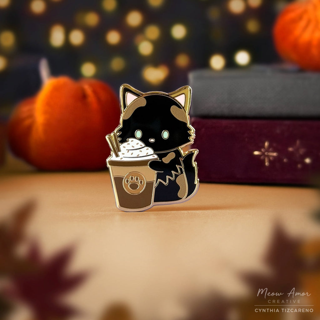 Fluffy Tortie Cat Choco Chip Coffee Enamel Pin