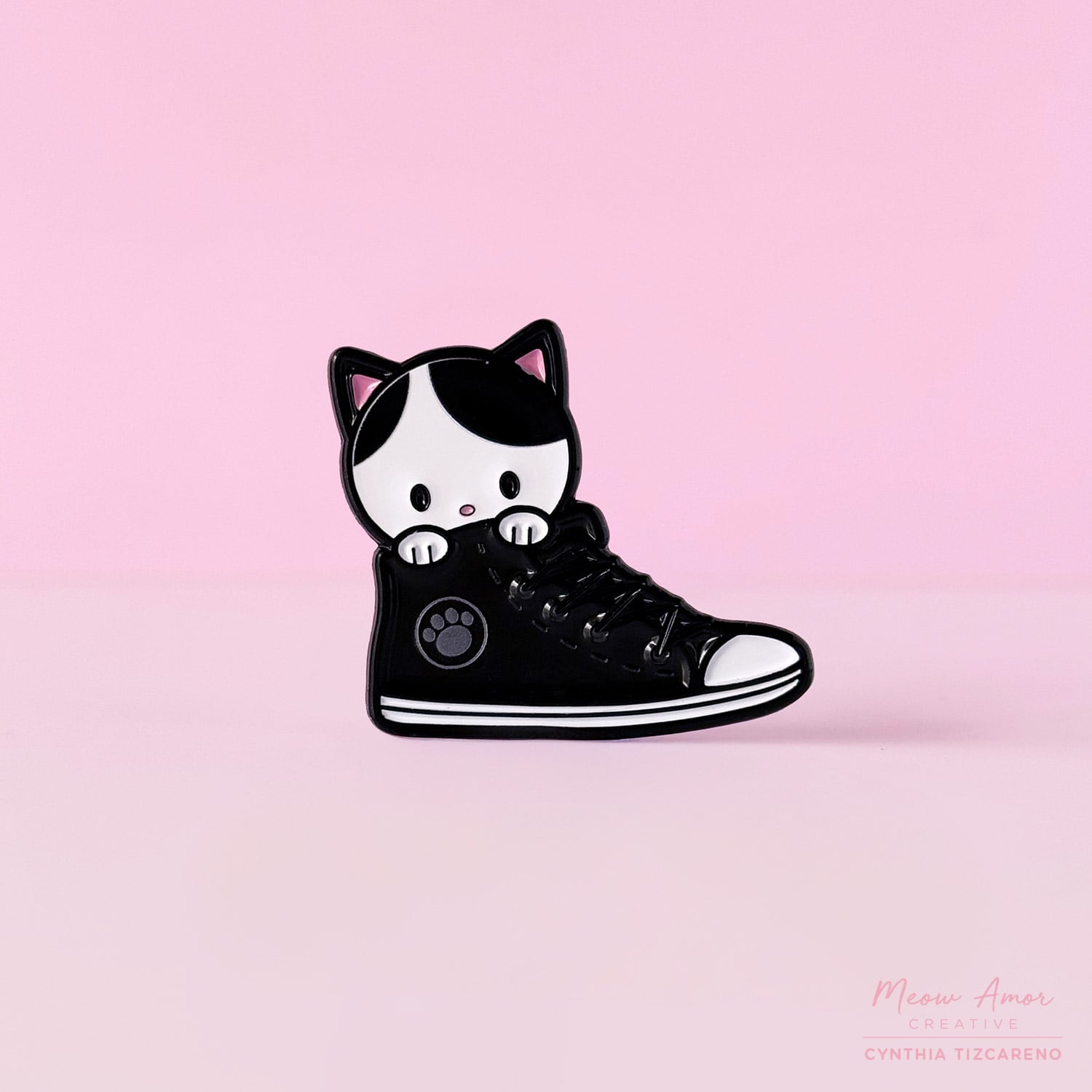 Celebrate your love for cats and sneakers with this sweet cat in a black sneaker with black dyed metal and screen printed details . Attach it to your jacket, bag, or hat for an instant touch of charm. This sweet sneaker cat pin is the perfect little accessory.