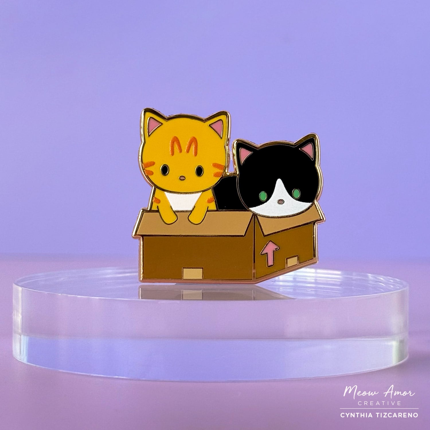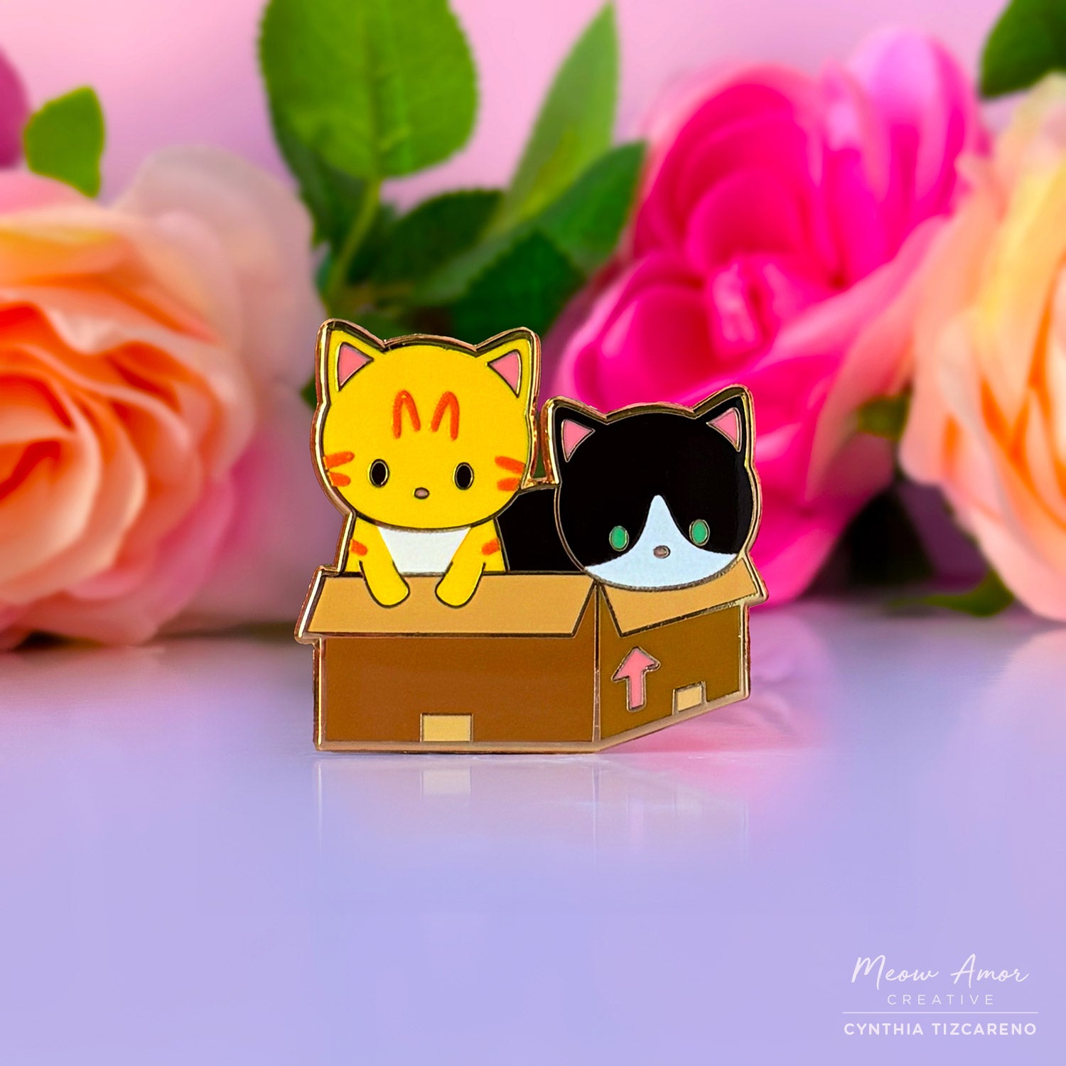 Meet the sweetest enamel pin featuring two cozy cats in a cardboard box. Whether you're pinning it to your bag, jacket, or collection, it's the perfect way to show your love for cats. A tiny treasure for anyone who finds joy in cute kitty moments.