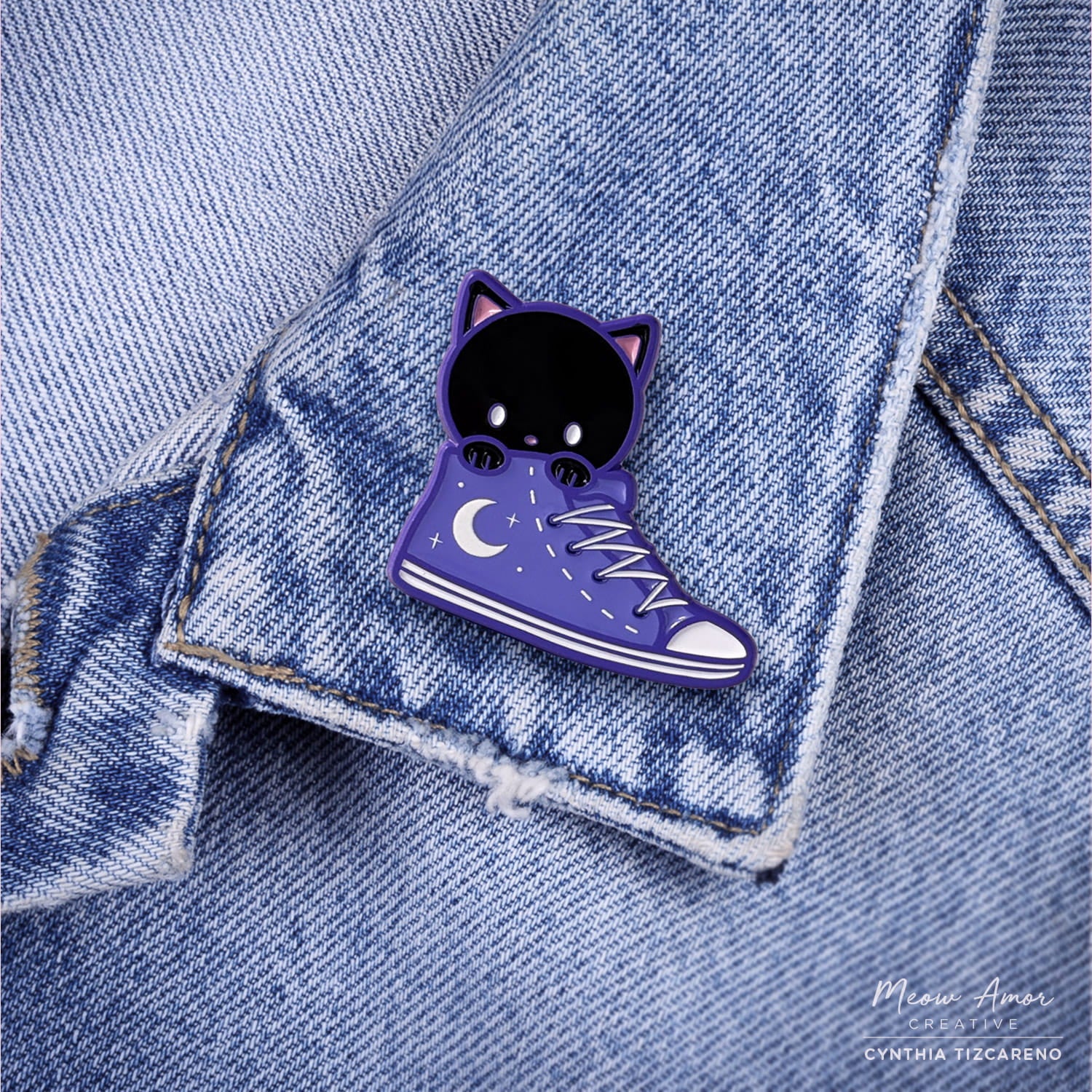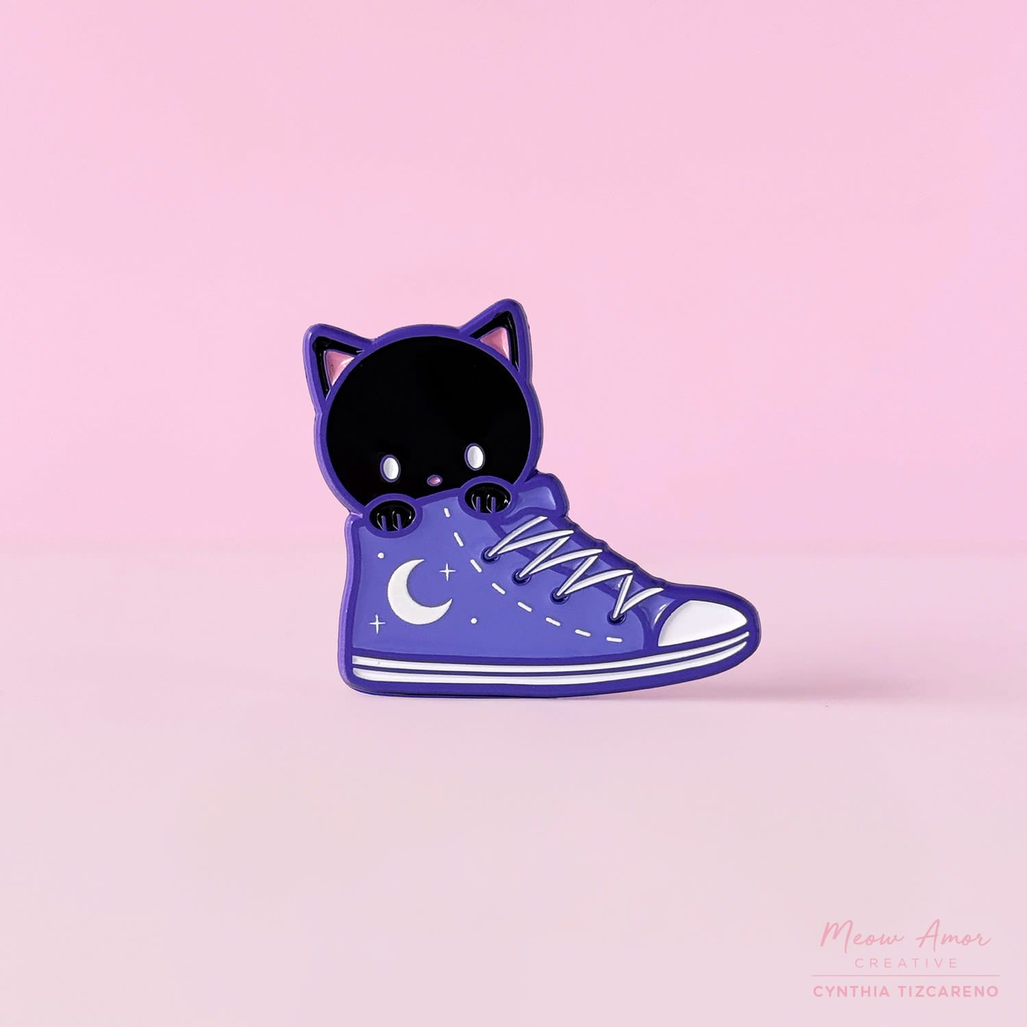 Celebrate your love for cats and sneakers with this enchanting cat in a purple sneaker pin with purple dyed metal and screen printed details . Attach it to your jacket, bag, or hat for an instant touch of charm. This sweet sneaker cat pin is the perfect little accessory.
