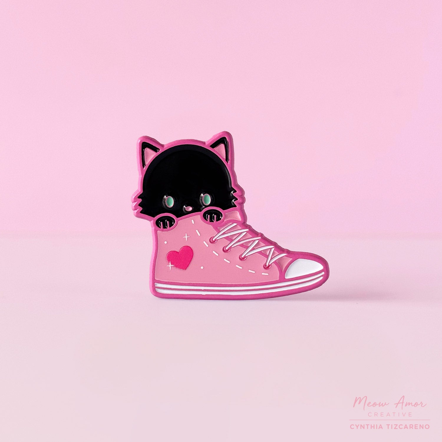 Celebrate your love for cats and sneakers with this sweet cat in a pink sneaker with pink dyed metal and screen printed details . Attach it to your jacket, bag, or hat for an instant touch of charm. This sweet sneaker cat pin is the perfect little accessory.