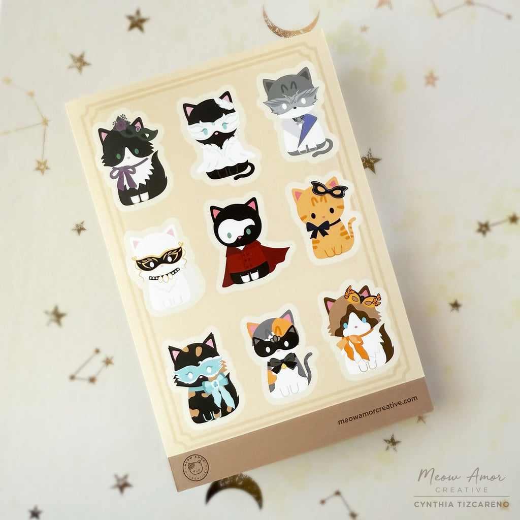 Add a touch of whimsy with the Masquerade Cats Vinyl Sticker Sheet. Featuring adorable cats wearing charming masks, these stickers are perfect for decorating laptops, notebooks, or phone cases. Made from durable vinyl, they’re easy to peel and stick, bringing a playful and cute vibe wherever you choose to use them.