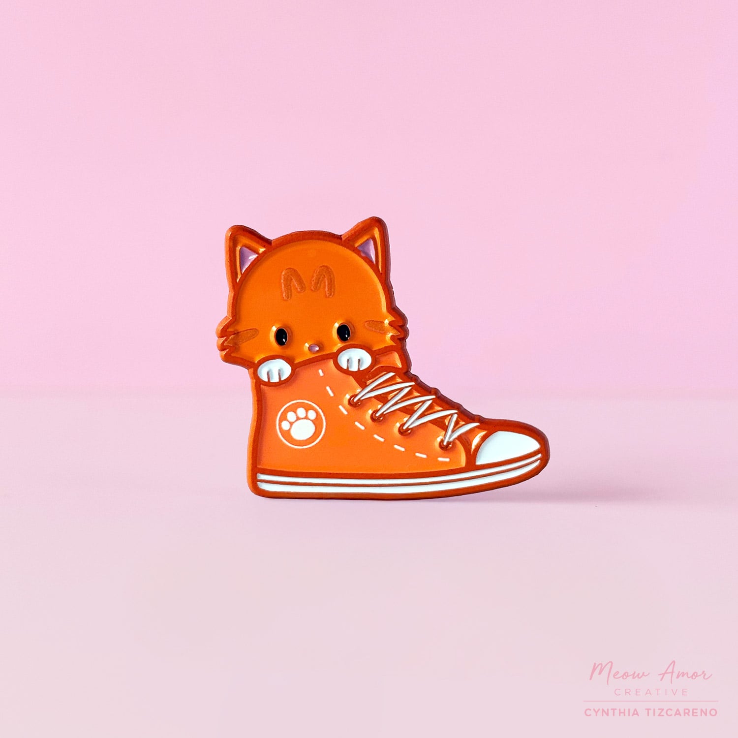 Celebrate your love for cats and sneakers with this sweet orange tabby cat in a orange sneaker with orange dyed metal and screen printed details . Attach it to your jacket, bag, or hat for an instant touch of charm. This sweet sneaker cat pin is the perfect little accessory.