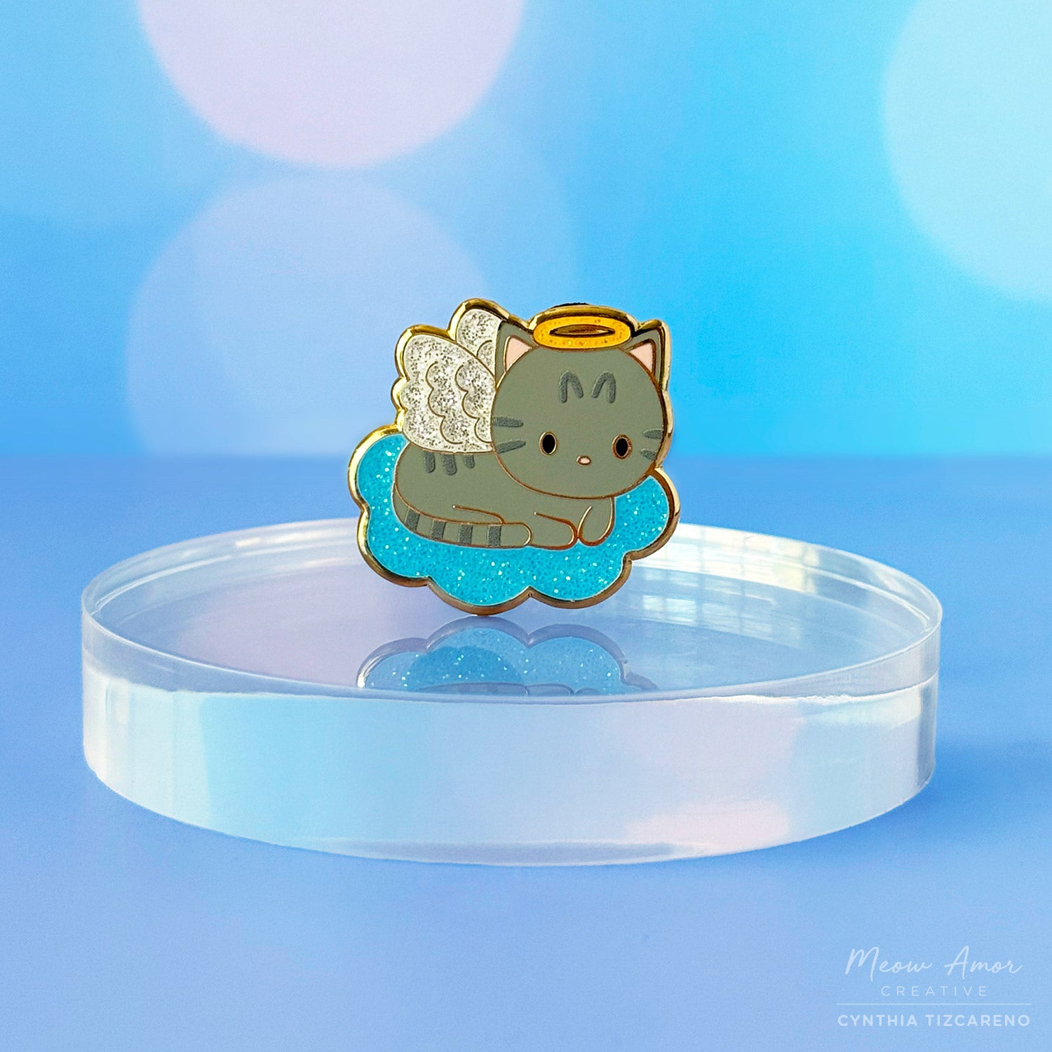 This sweet enamel pin features an gray tabby cat resting on a glittery cloud, making it a heartfelt keepsake to remember your beloved gray tabby. Its simple and cute design adds a gentle sparkle, offering a comforting way to keep your furry friend close to your heart.