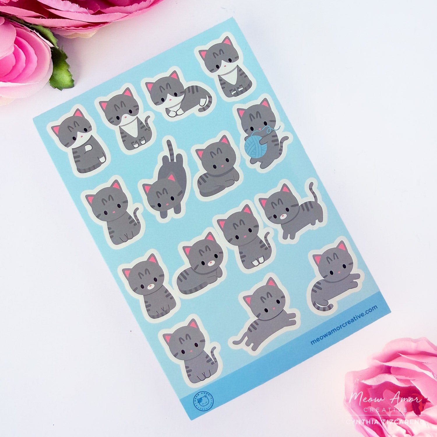 This vinyl sticker sheet features a variety of gray tabby cats. Brighten up your belongings with these sweet, durable stickers that stick to laptops, water bottles, journals, and more.