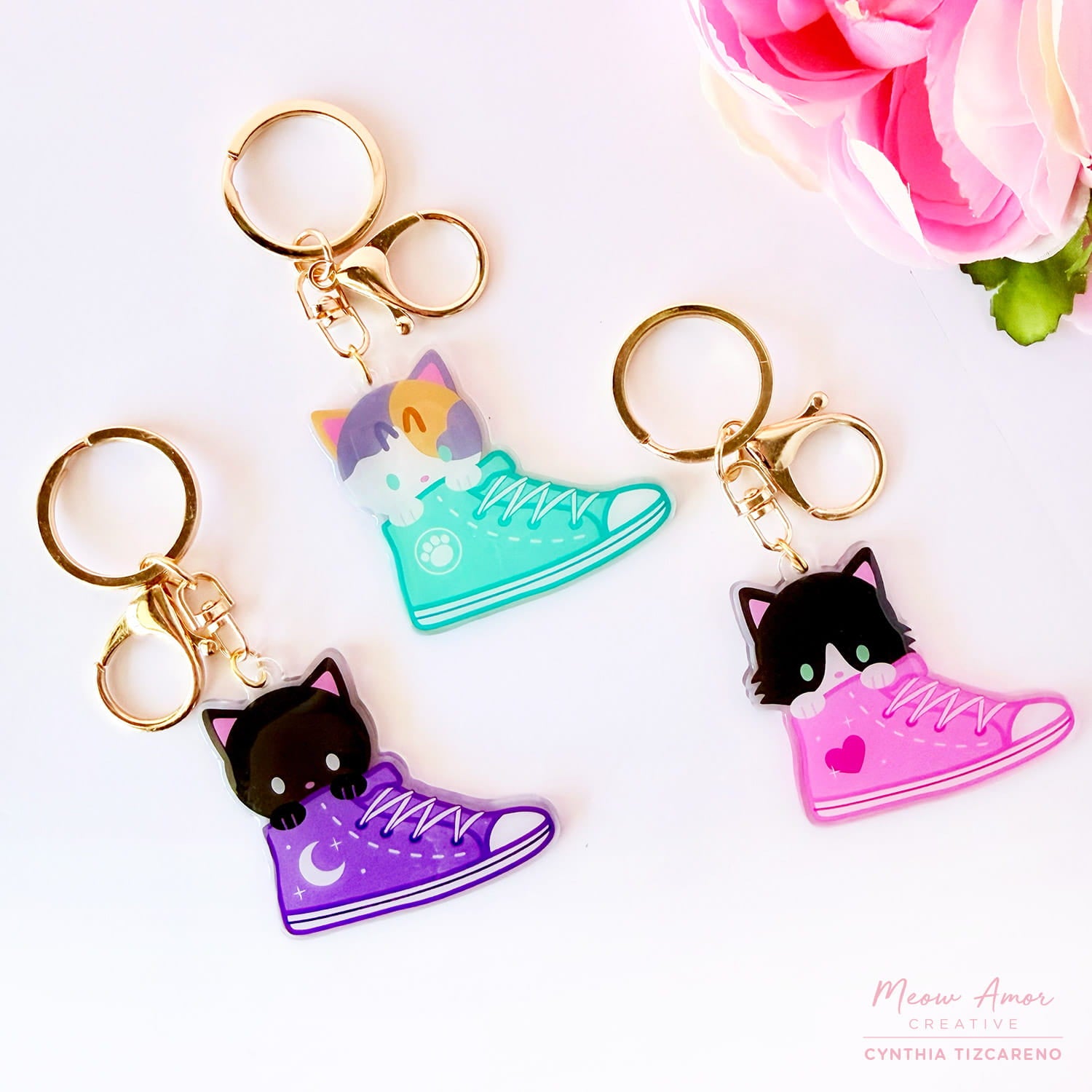 Charming acrylic accessory featuring a precious cat in a mint sneaker, complete with a gold keychain attachment. Perfect for adding sweetness to your everyday carry.