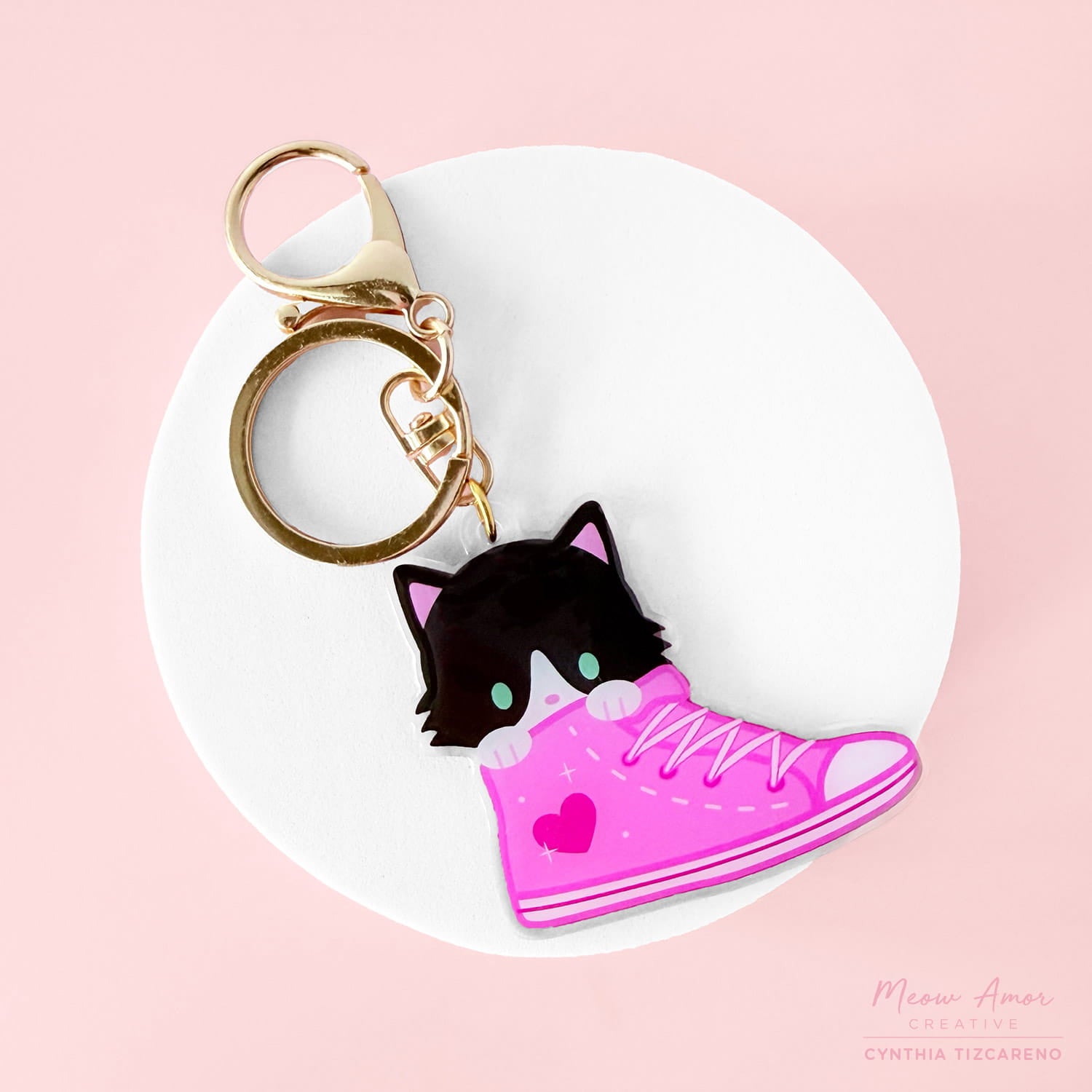 Charming acrylic accessory featuring a precious cat in a pink sneaker, complete with a gold keychain attachment. Perfect for adding sweetness to your everyday carry.