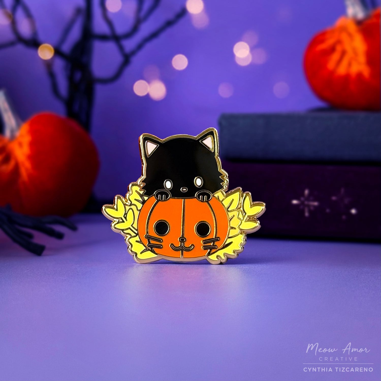 Add a touch of cuteness to your accessory collection with our Pumpkin Cat Enamel Pin. Featuring a fluffy black cat in a pumpkin, this pin is the purr-fect addition to any outfit.