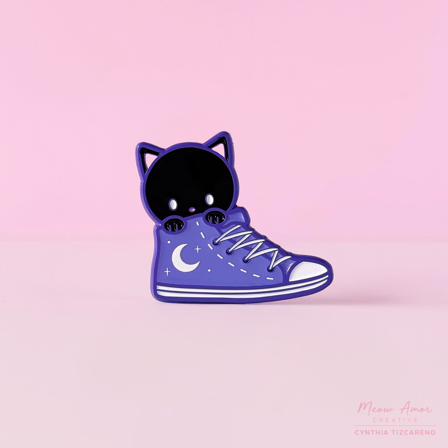 Celebrate your love for cats and sneakers with this enchanting cat in a purple sneaker pin with purple dyed metal and screen printed details . Attach it to your jacket, bag, or hat for an instant touch of charm. This sweet sneaker cat pin is the perfect little accessory.