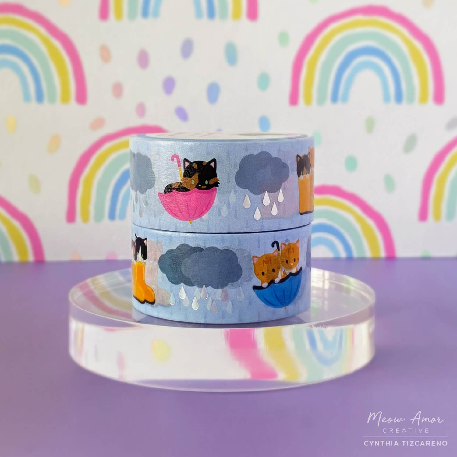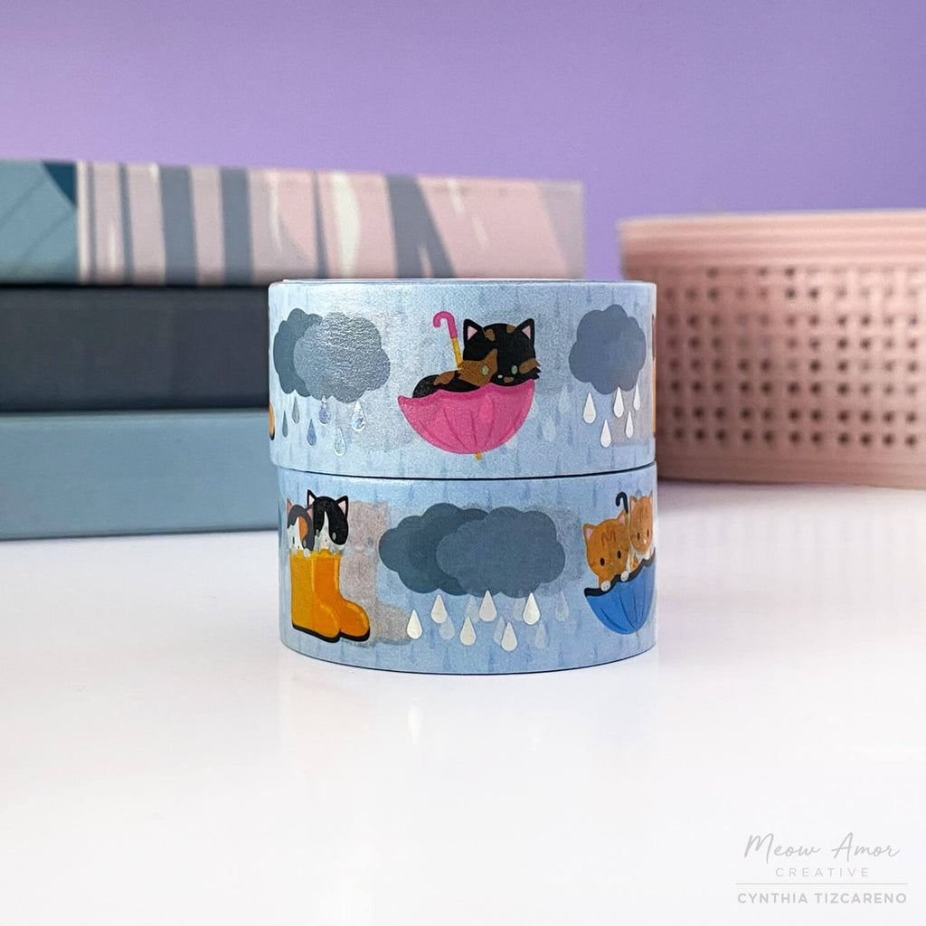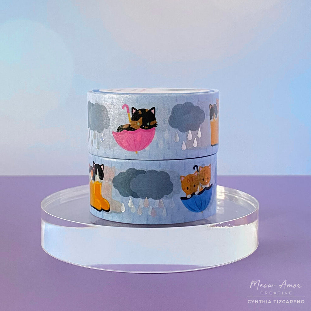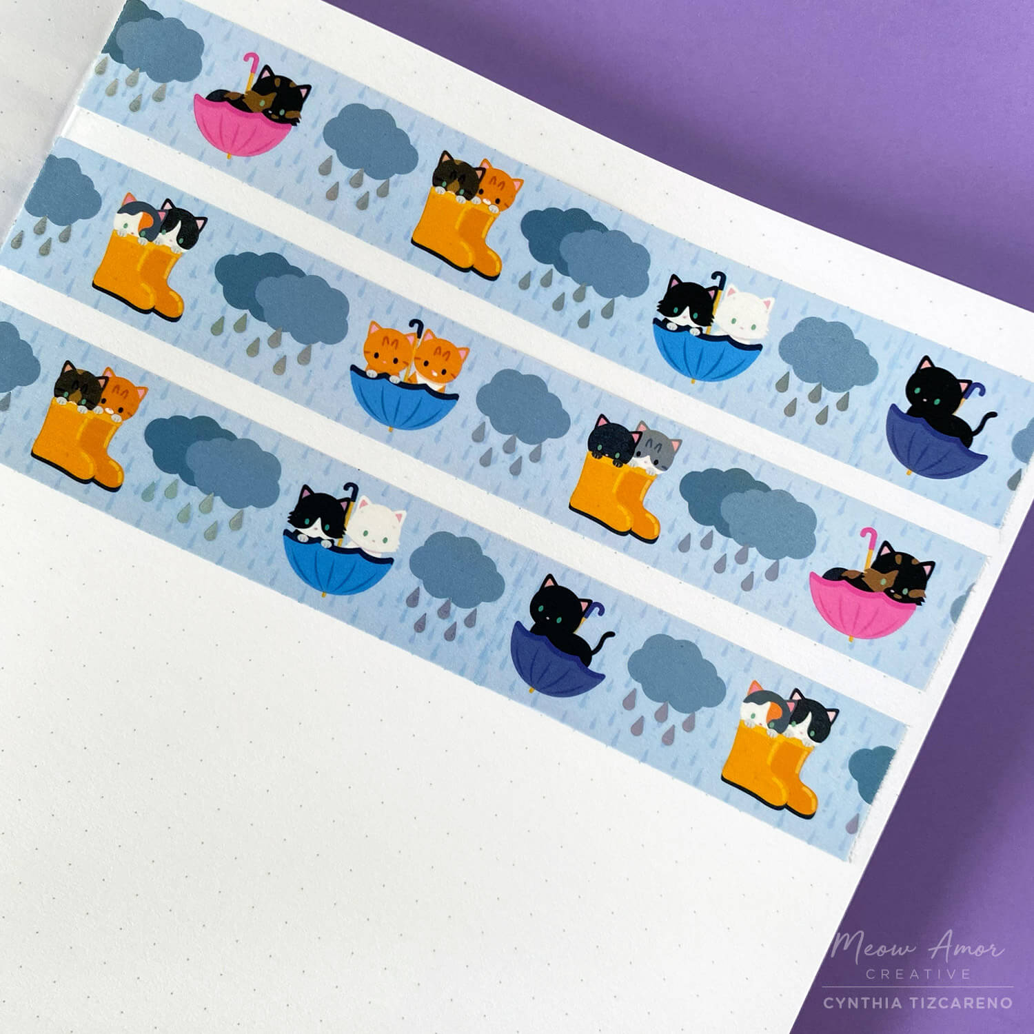 Brighten up your planner with this adorable "Rainy Day Cats" washi tape! Featuring cats with umbrellas and rain boots, plus holographic rain drops, it's the purrrfect way to keep the showers away (at least on the page)! The 20mm tape is purrfect for any cat-lovin' crafter.