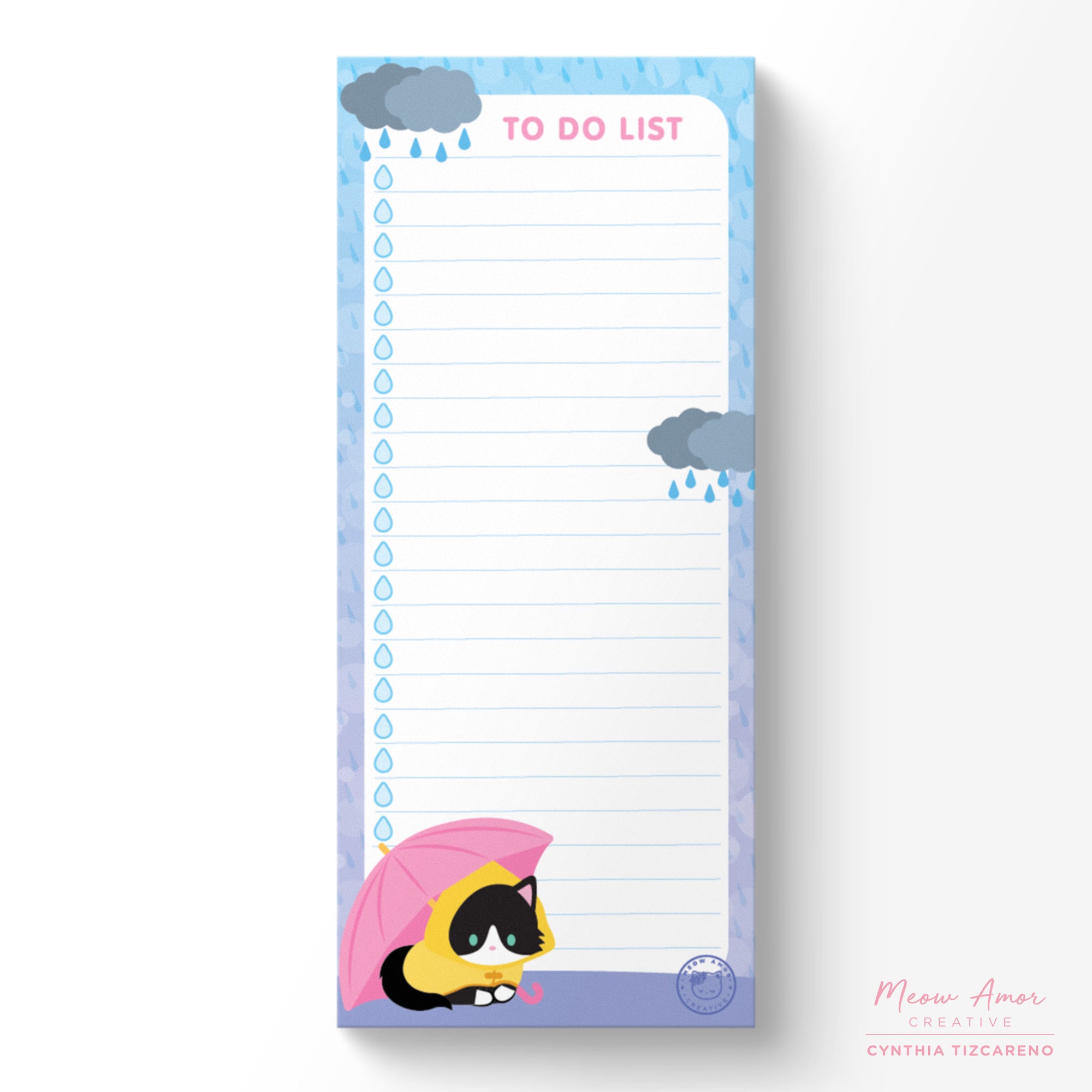 Keep your tasks in check with this charming tuxedo cat notepad. Featuring a tuxedo cat in a raincoat and umbrella, it's the perfect companion for organizing your to-do list while adding a sweetness to your day.