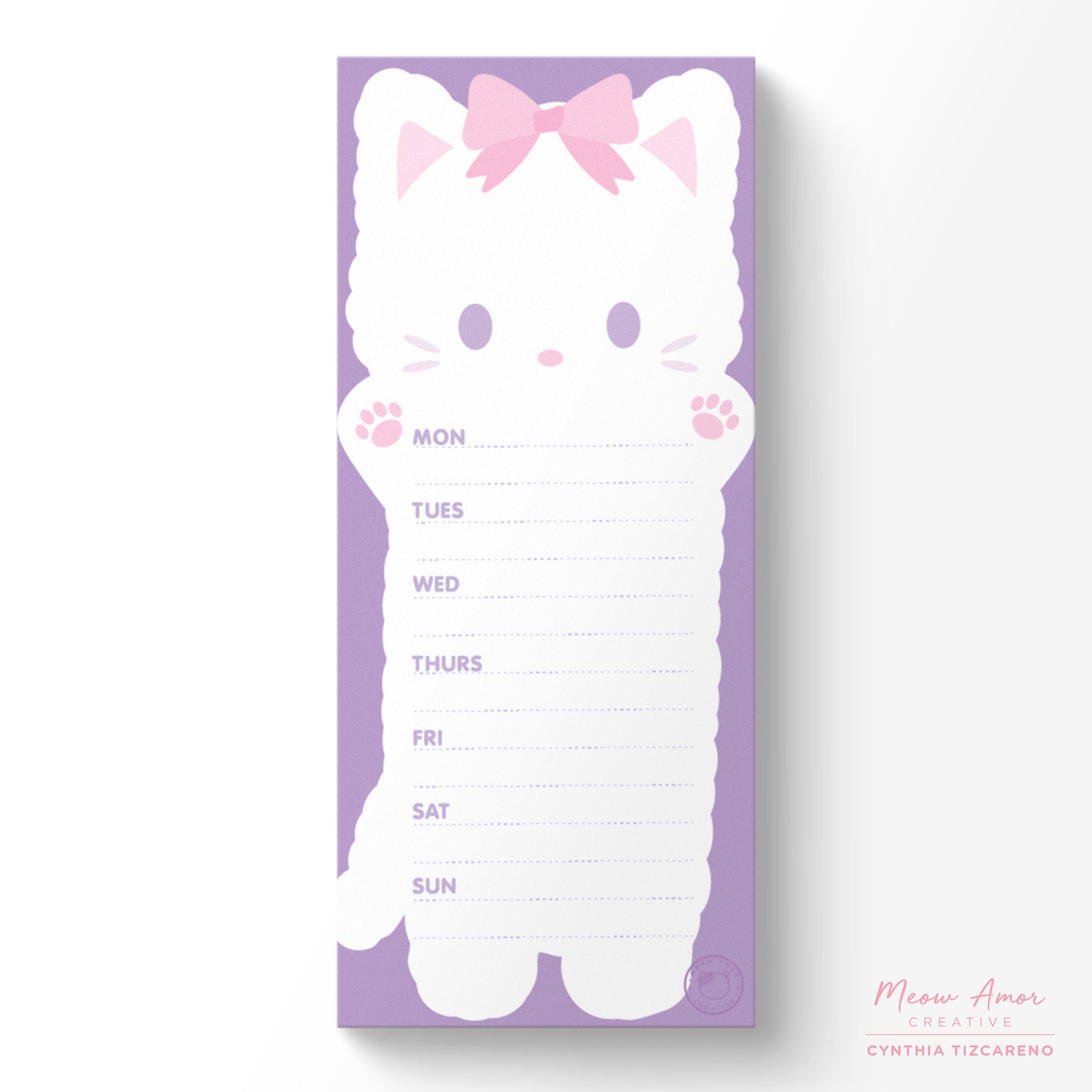 Organize your week with this precious notepad featuring a darling white kitty wearing a pink bow. Perfect for planning your days with a touch of feline charm and sweetness.