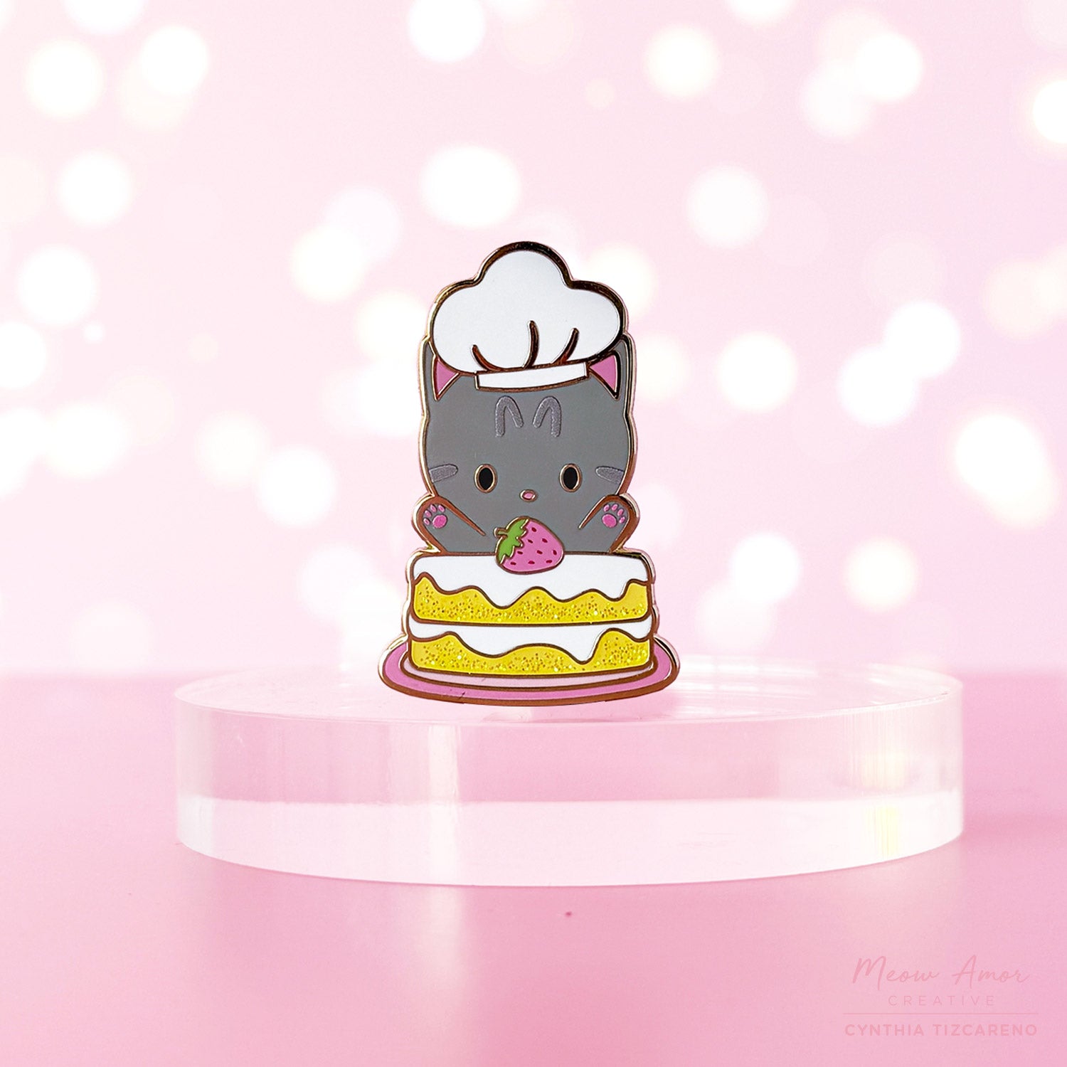 This adorable enamel pin features tabby cat pastry chef with a strawberry cake. Perfect for cat lovers and baking enthusiasts who want to wear their passions.